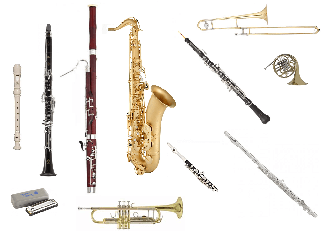 - strumenti a fiato (clarinetto, flauto, ottavino, tromba, sax, flicorno, corno, tuba);